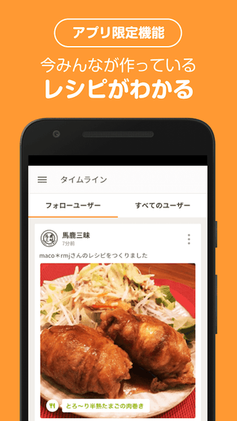 クックパッドは料理が得意だったり、プロの料理人がレシピを伝授するのでなく、一般ユーザーが「こんなことがあってこういうのを作ってみた」というレシピが多数載っています。時短や節約、ごく普通に、日常的に使えるレシピが基本となっているので嬉しい。お気に入りのユーザが見つかったら、その人をフォローする機能もあるので、新レシピも見逃さない。